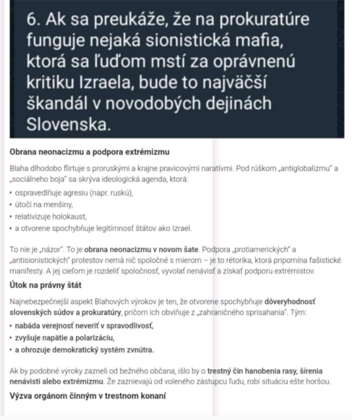 Súčasne upozornilo na to, že Blaha šíri hrozby voči prokuratúre, súdom, novinárom či menšinám, relativizuje alebo prekrúca význam fašizmu, podsúva verejnosti konšpirácie o „sionistickej mafii“ a „deep state“ v slovenských štátnych orgánoch, podnecuje k násiliu a zastrašuje vykonávateľov spravodlivosti výzvami typu „za toto musia padať hlavy“ či „musíme pritvrdiť“.