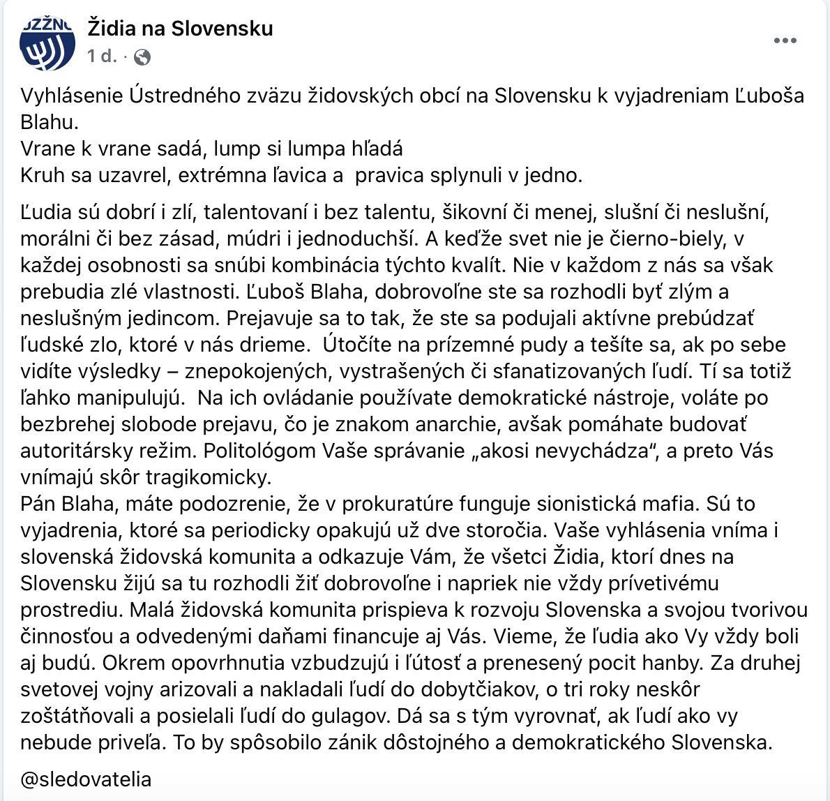 „Vieme, že ľudia ako vy vždy boli aj budú. Okrem opovrhnutia vzbudzujú i ľútosť a prenesený pocit hanby. Za druhej svetovej vojny arizovali a nakladali ľudí do dobytčiakov, o tri roky neskôr zoštátňovali a posielali ľudí do gulagov. Dá sa s tým vyrovnať, ak ľudí ako vy nebude priveľa. To by spôsobilo zánik dôstojného a demokratického Slovenska,“ uviedol Ústredný zväz židovských náboženských obcí v SR s dodatkom, že malá židovská komunita prispieva k rozvoju Slovenska a svojou tvorivou činnosťou a odvedenými daňami financuje aj Blahu.